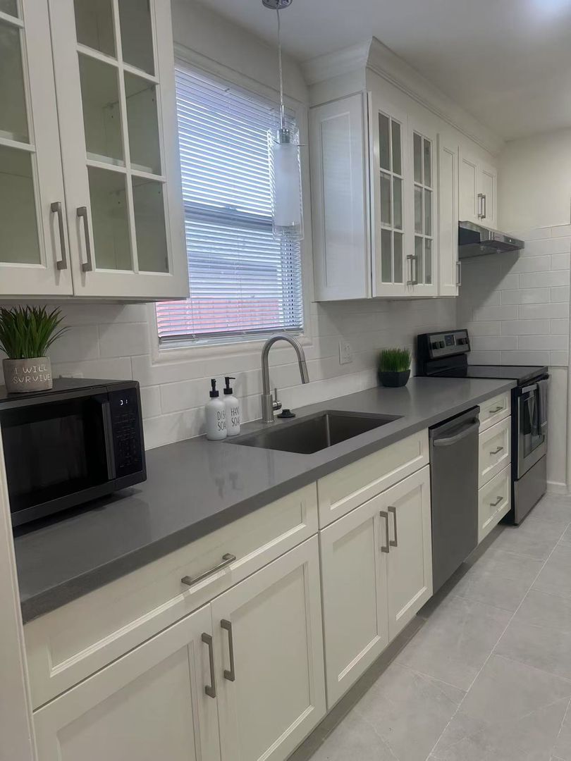 *Fully equipped kitchen with full-size refrigerator, stove, microwave, small appliances, and cooking essentials